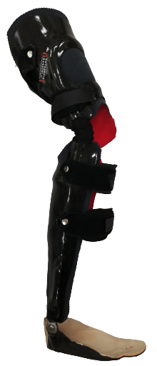 Tutore coscia-gamba-piede costruito su calco in gesso realizzato in fibra di carbonio. Permette di stabilizzare il ginocchio durante la stazione eretta. L’articolazione al ginocchio prevede di effettuare manualmente lo sbloccaggio, per favorire la posizione seduta, e il bloccaggio per conferire stabilità durante la deambulazione. L’articolazione malleolare è progettata con la possibilità di regolare l’escursione articolare e la spinta dorsi-flessoria. Il tutore presenta una sola asta pertanto è interamente realizzato in fibra di carbonio per non essere soggetto a torsioni.